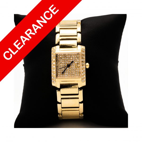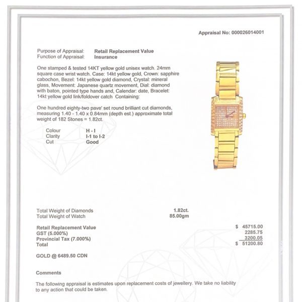 Take a look at this! 24mm square wrist watch with a 14k gold case, sapphire cabochon! This watch features 182 pave set round brilliant cut diamonds.