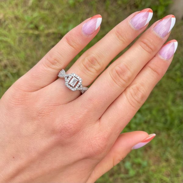 Marvelous emerald cut diamond engagement ring with a crossover band!