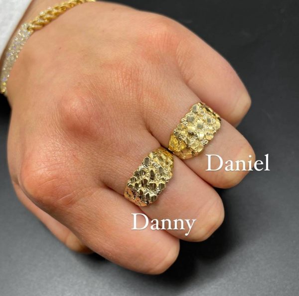 10KT hollow back yellow gold nugget ring. The Danny has chunky diamond cut nuggets on the front and going off on the sides of the band.