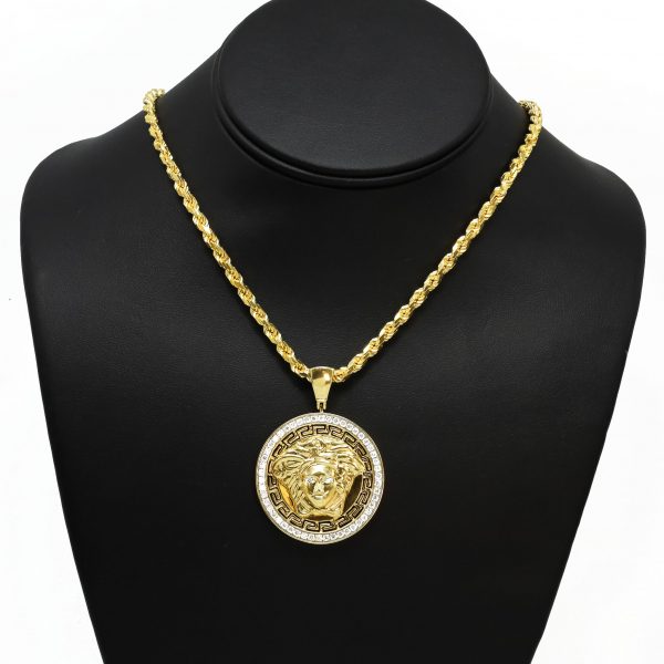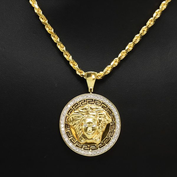 Diamond Medusa pendant with diamond border and diamond set in the eyes with a gold caged back