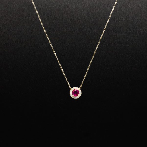 Style: Ruby With Diamond Halo Pendant Attached To Cable Chain With Adjustable Hoop