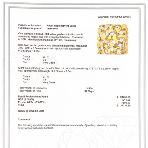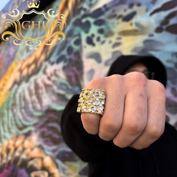 10 KT yellow gold Snoop Nugget ring with round lab created diamonds, totaling 17 diamonds.