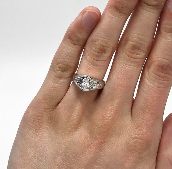 Modern ladies diamond ring, mixed with princess cut diamonds and a Marquise diamond in the centre.