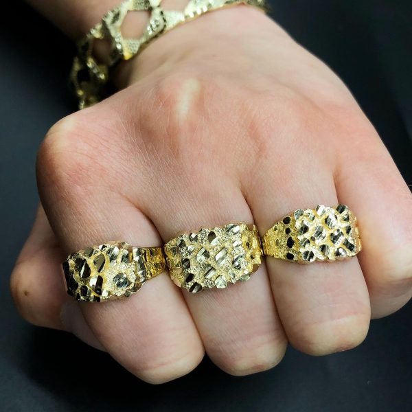 10KT hollow back yellow gold nugget ring. The Max has chunky diamond cut nuggets on the front and a smooth high polish band. Max is an awesome nugget ring if you’ve never bought one before and want to try the style out. (I recommend this on the pinky finger for a girl or guy!)