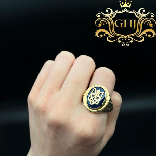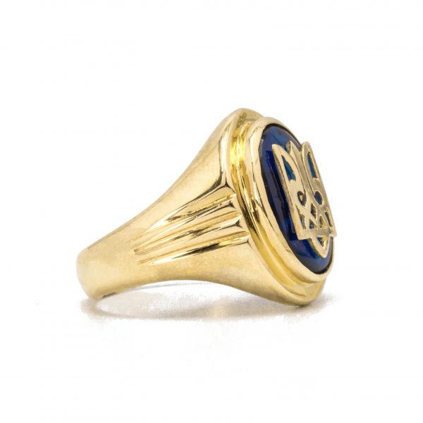 10 KT yellow gold high polish round Ukrainian trident ring with a synthetic blue stone