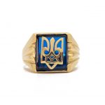 10 KT yellow gold high polish round Ukrainian trident ring with a synthetic blue stone