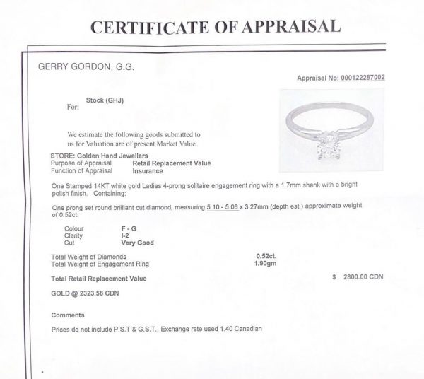 Diamond Clarity and Colour: I-2 clarity, F-G colour