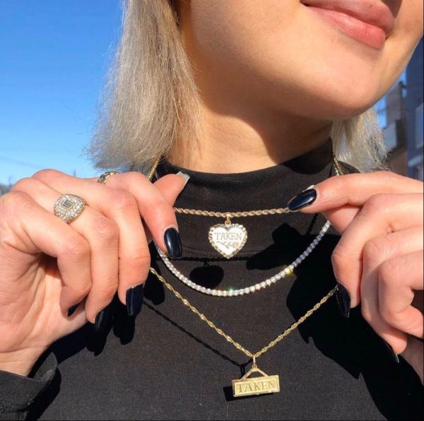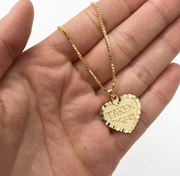 10 kt yellow gold pendant including: diamond cuts on the edges of the heart and a flower in the middle of the pendant with the words “taken”.